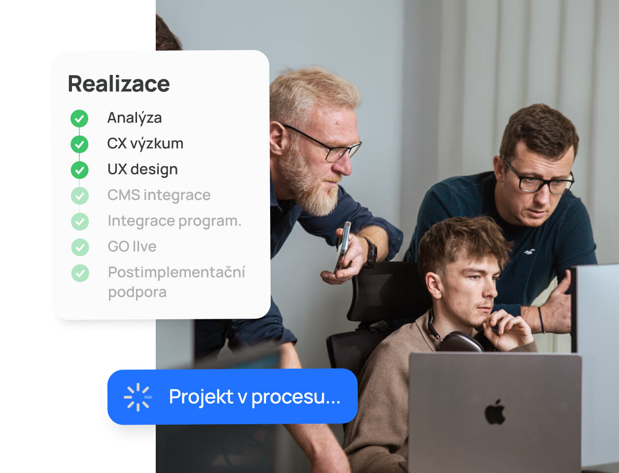 Řešení navrhneme a kompletně realizujeme UX návrh, design i programátorské práce. Pokud budeme napojovat systémy třetích stran, budeme potřebovat buď vaši koordinaci nebo svolení jednat vaším jménem.